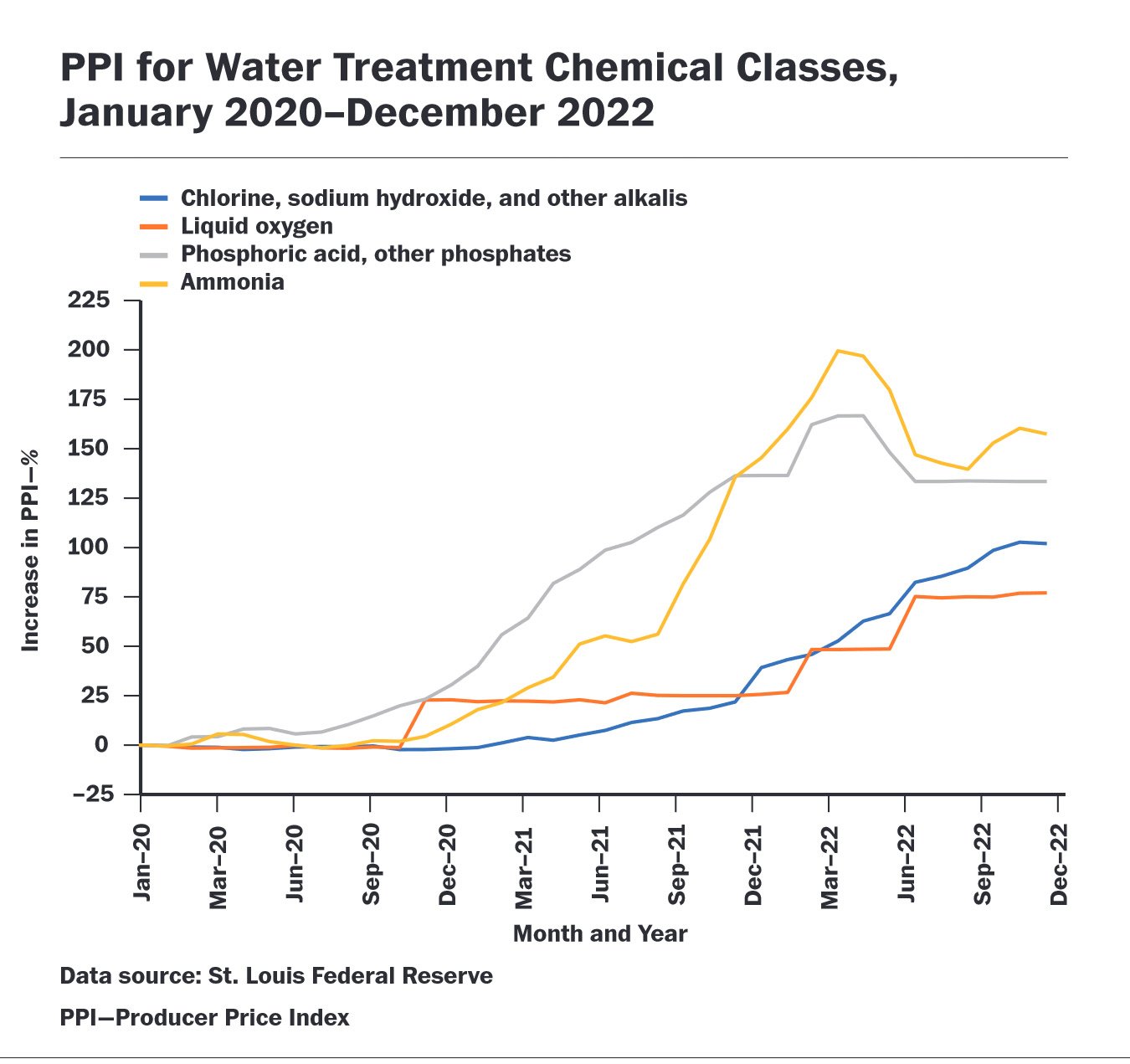 A recent article featured in the AWWA Journal (May 2023) further emphasized challenges faced by the water industry due to supply chain disruptions and the rising prices of chemicals, reflected in the Producer Price Index (PPI). The authors discussed the strategic utilization of onsite generation to mitigate these disruptions and the resulting price shocks.